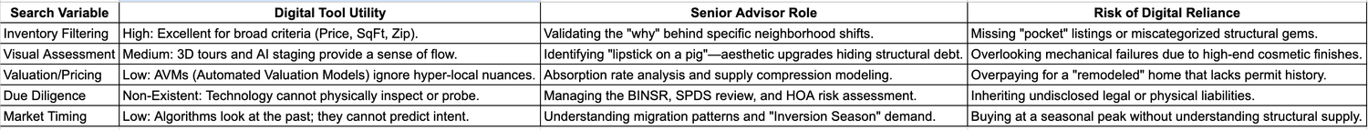 These are the anomalies that define the value of a home. An AI may be able to "stage" a room to show you how your furniture fits, but it cannot stage a conversation with a listing agent to discern the true motivation behind a 1031 exchange or a sudden relocation.
